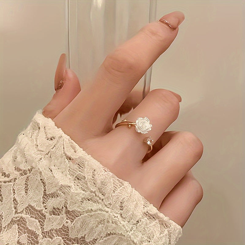 Este anillo, bañado en oro de 18k, presenta un diseño delicado inspirado en una rosa blanca, decorado con una circonia que ofrece un brillo sutil y elegante.