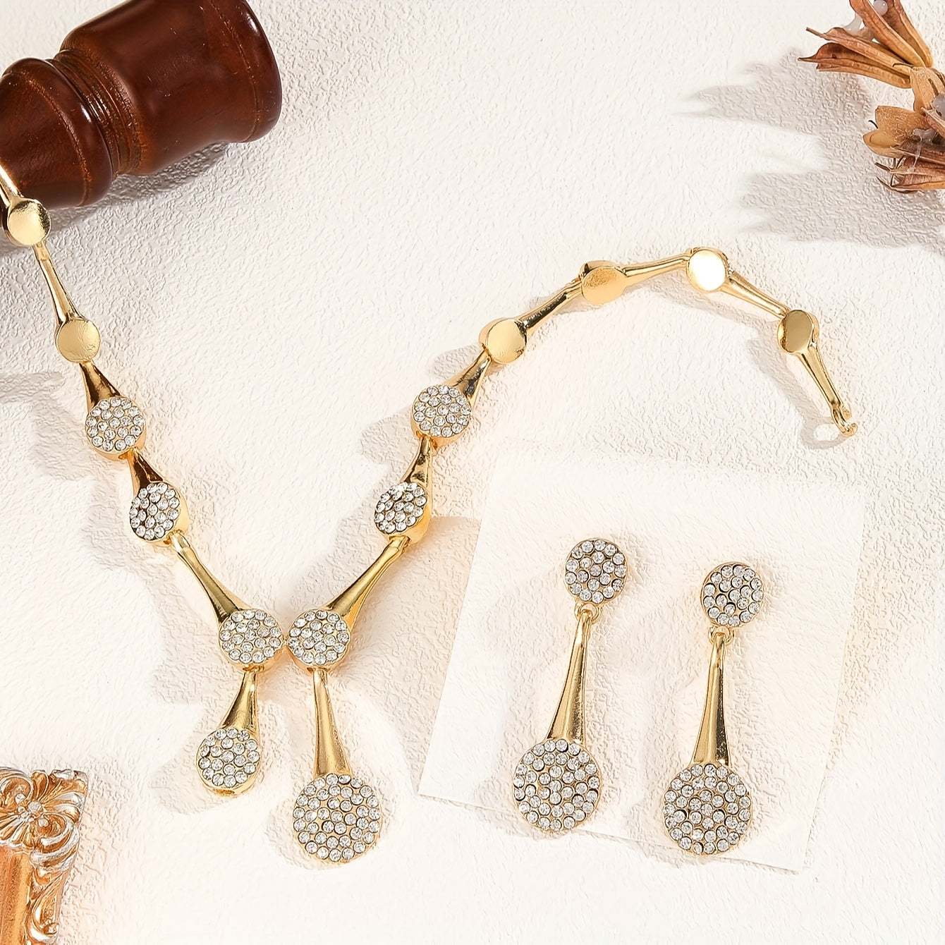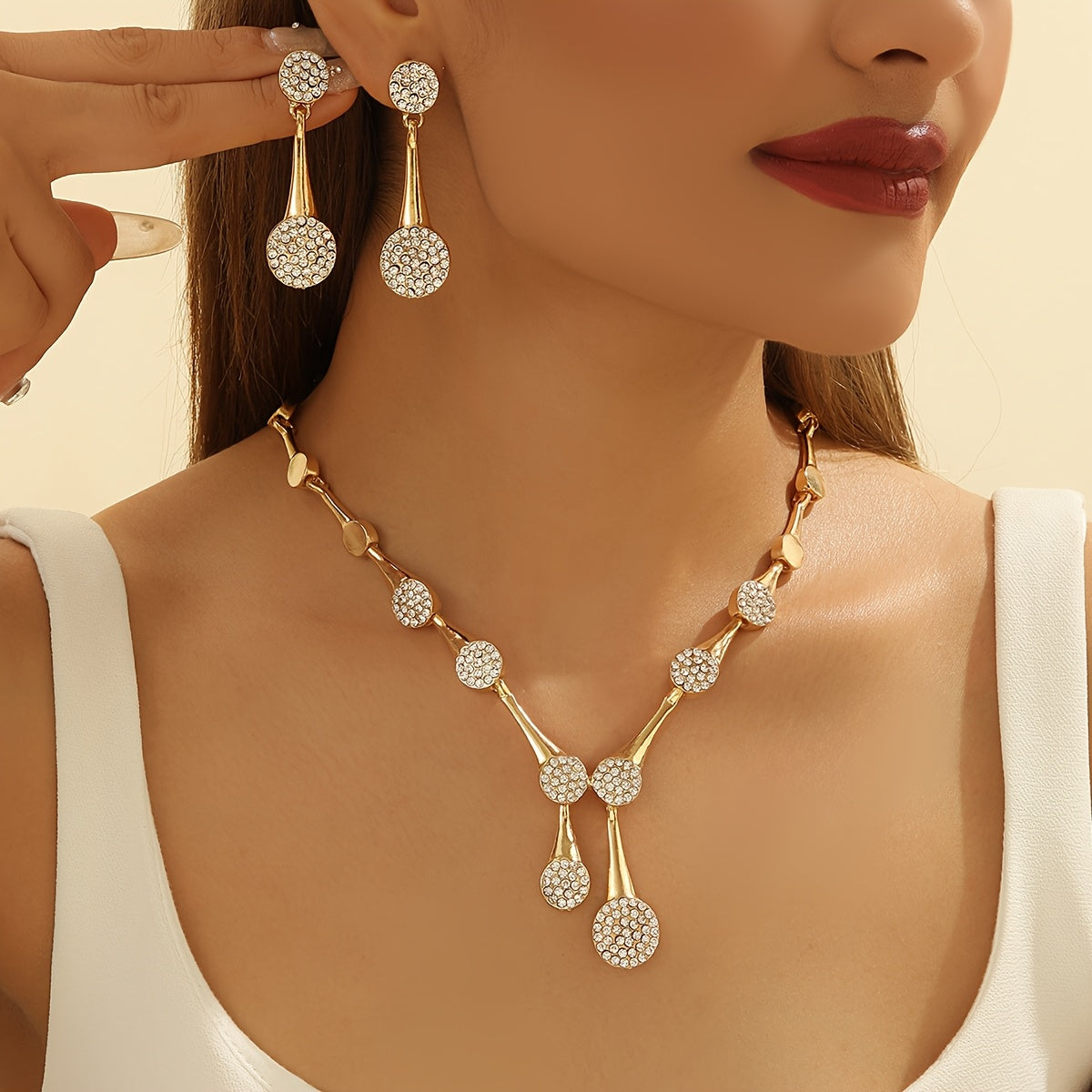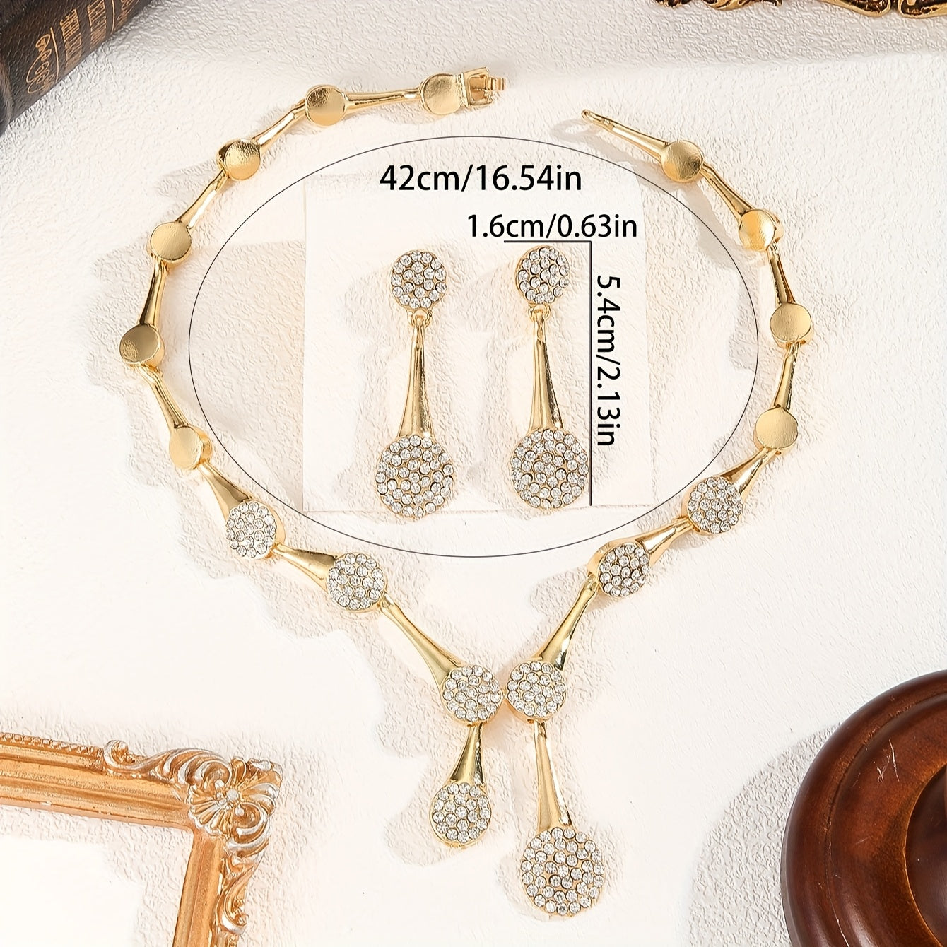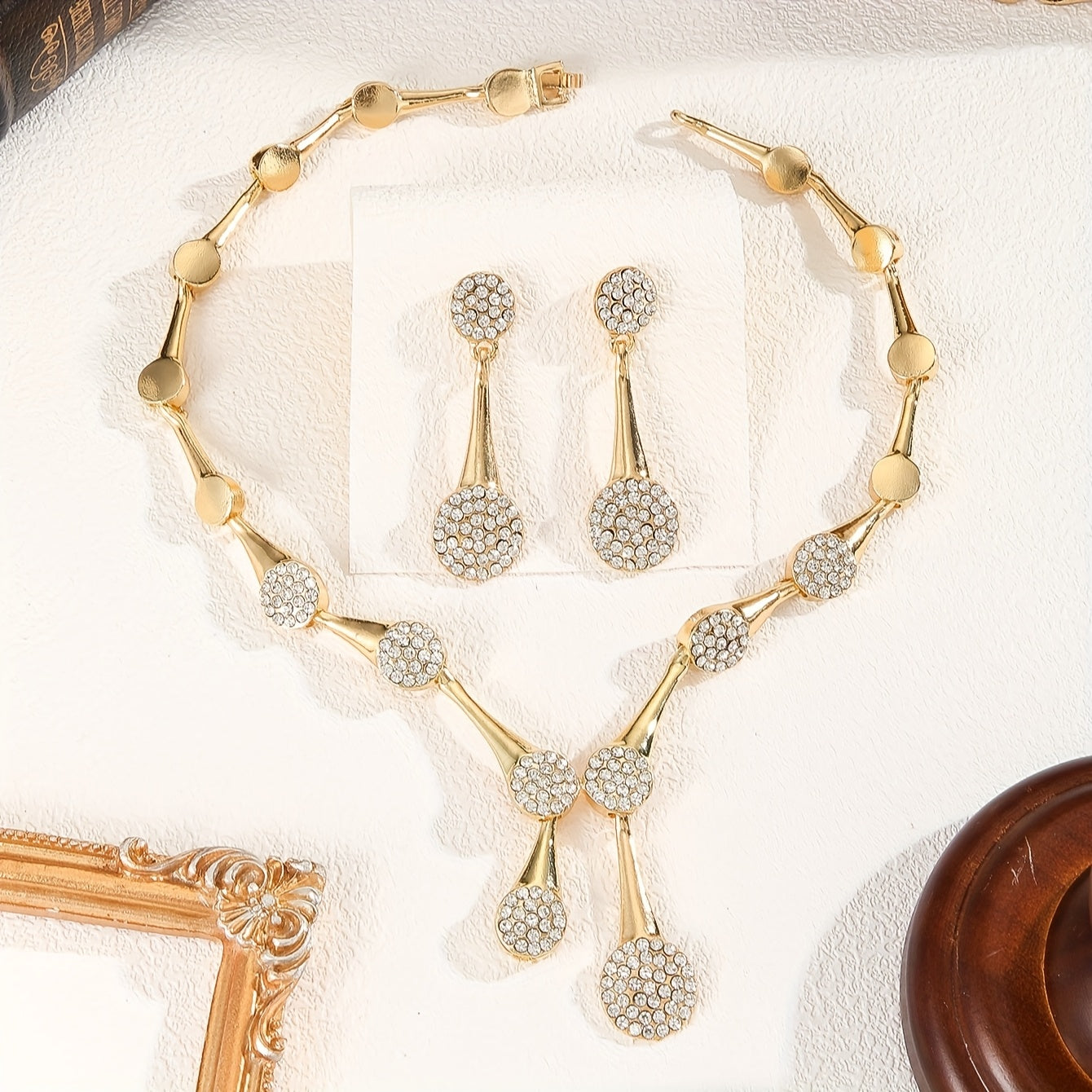 Este conjunto incluye collar y aretes con formas circulares incrustadas en delicadas piedras brillantes.