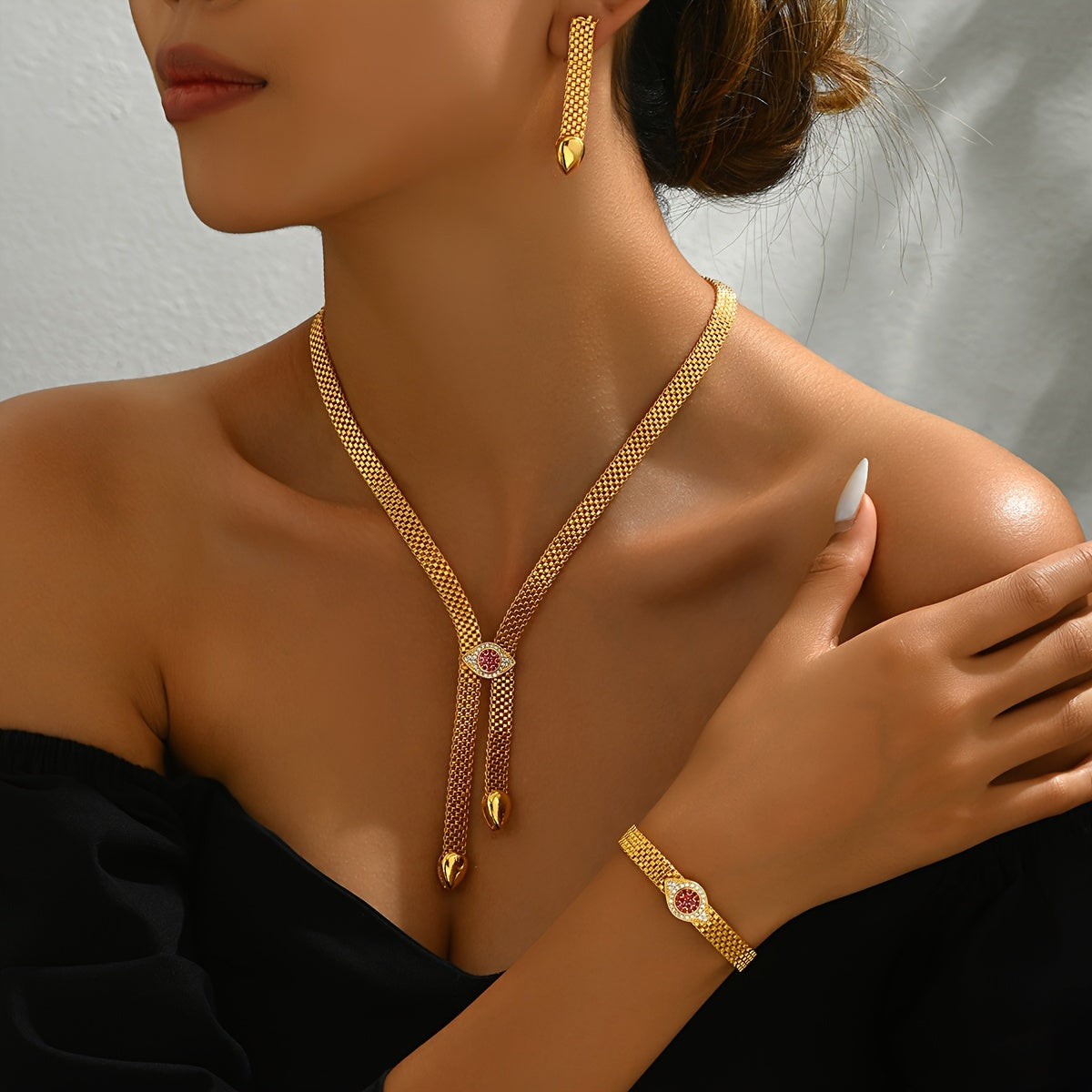 Elegancia atemporal y diseño refinado se unen en este conjunto de joyas que incluye collar, anillo ajustable y aretes.